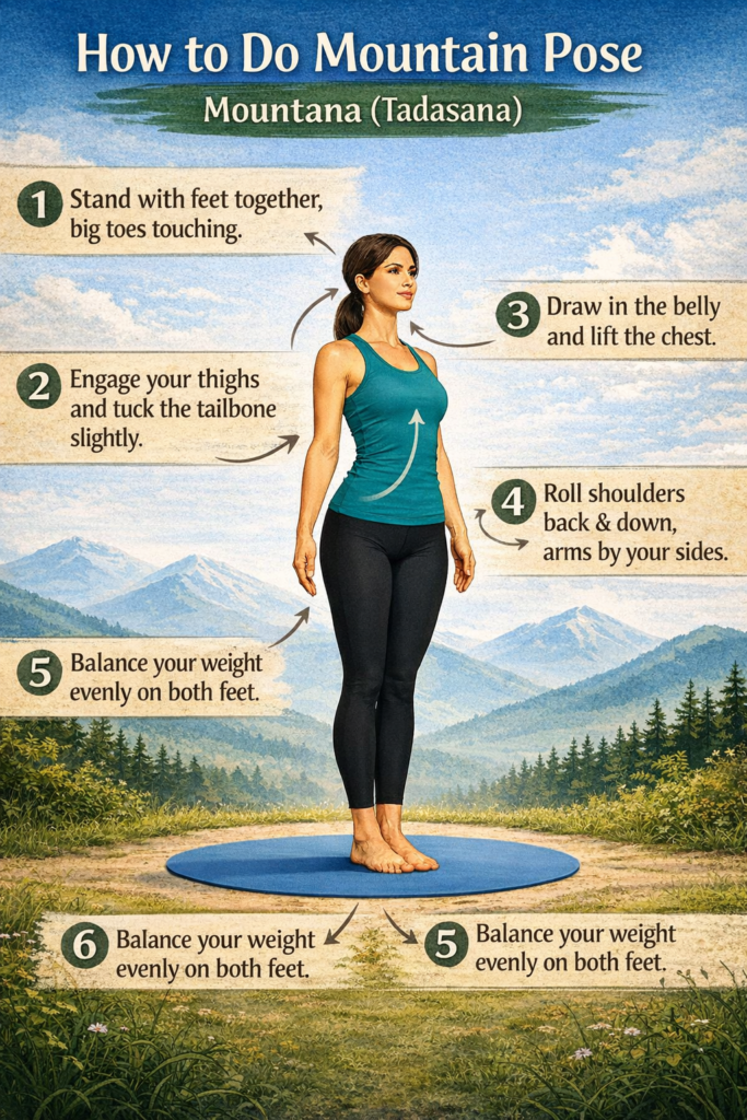 Mountain Pose may look simple, but performing it correctly helps you build balance, posture, and body awareness. Follow these steps carefully: